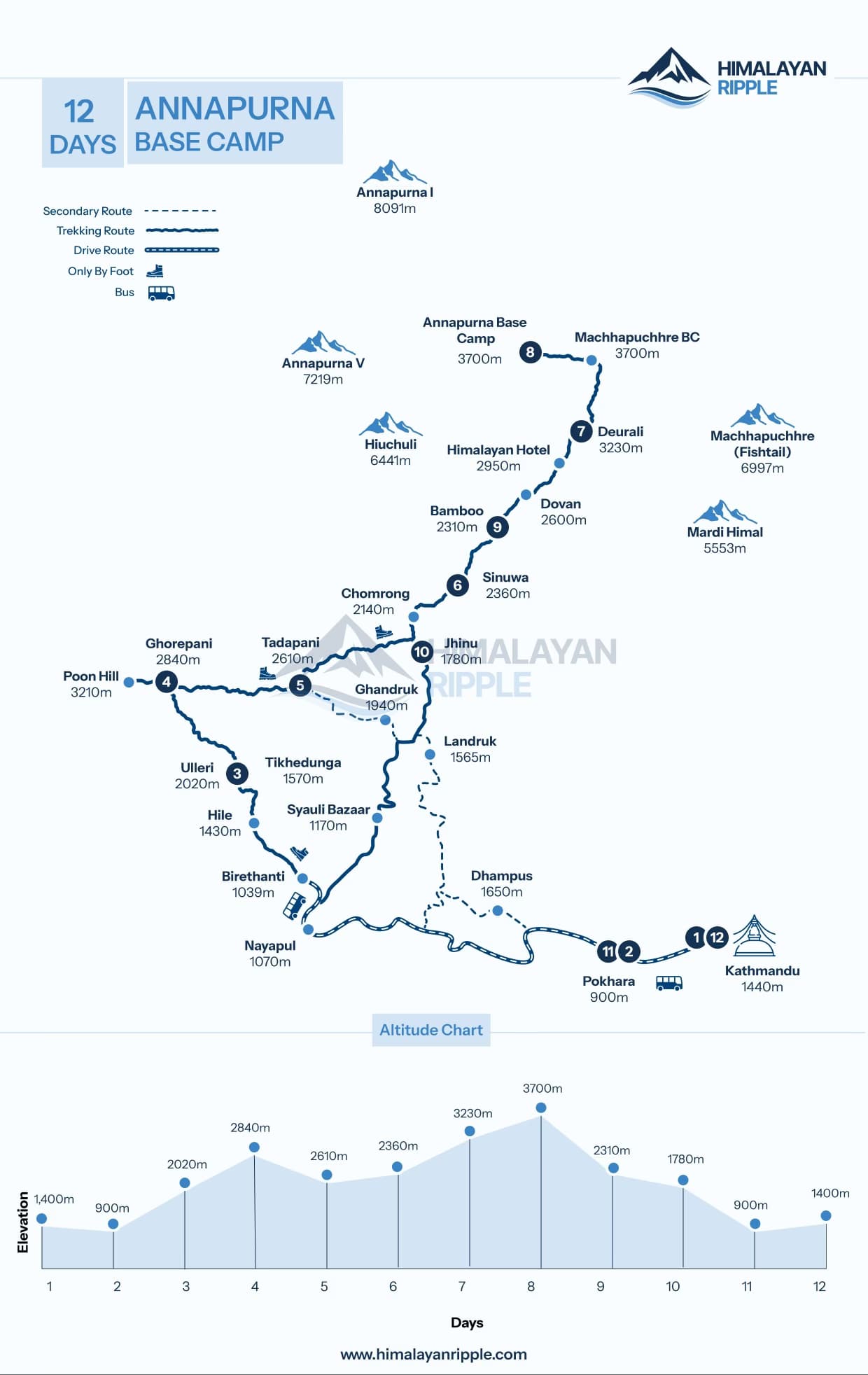 The trek begins from Pokhara, Nepal’s beautiful lakeside city, and gradually ascends through lush subtropical forests, terraced farmlands, and traditional Gurung and Magar villages. As you move deeper into the Annapurna region, the trail passes through charming settlements such as Ghandruk, Chhomrong, Bamboo, Deurali, and Machhapuchhre Base Camp (MBC), each offering unique cultural experiences and stunning mountain scenery.